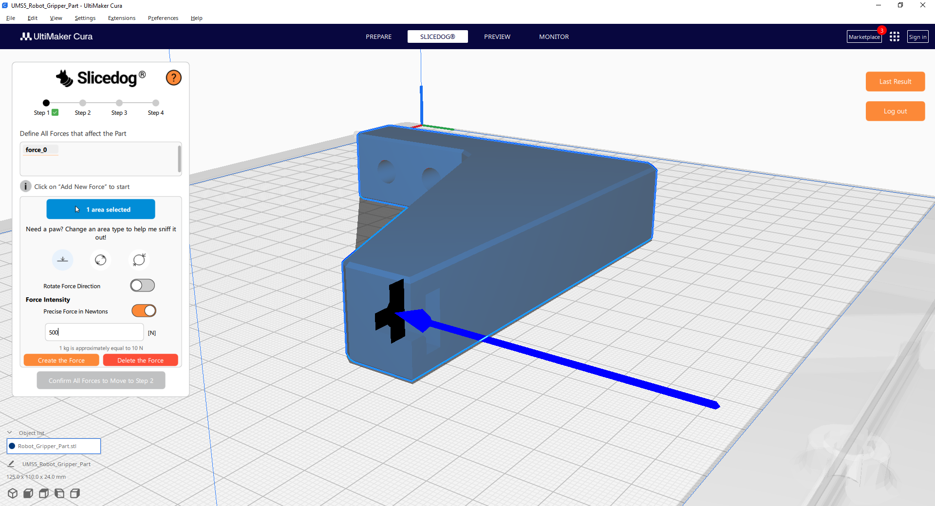 Click “Add Force” in the Slicedog panel. Then click the front T-shaped surface on the model and set the force to 500 N.