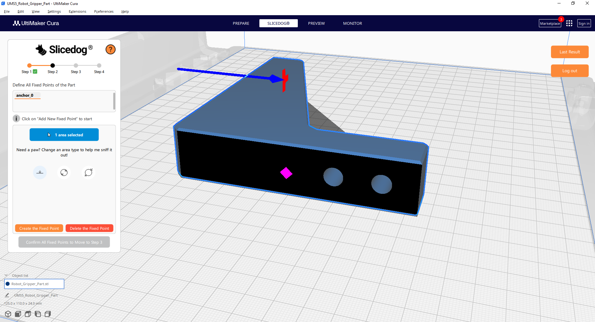 Click “Add Fixed Point” in the Slicedog panel, then select the face to place the fixed point.