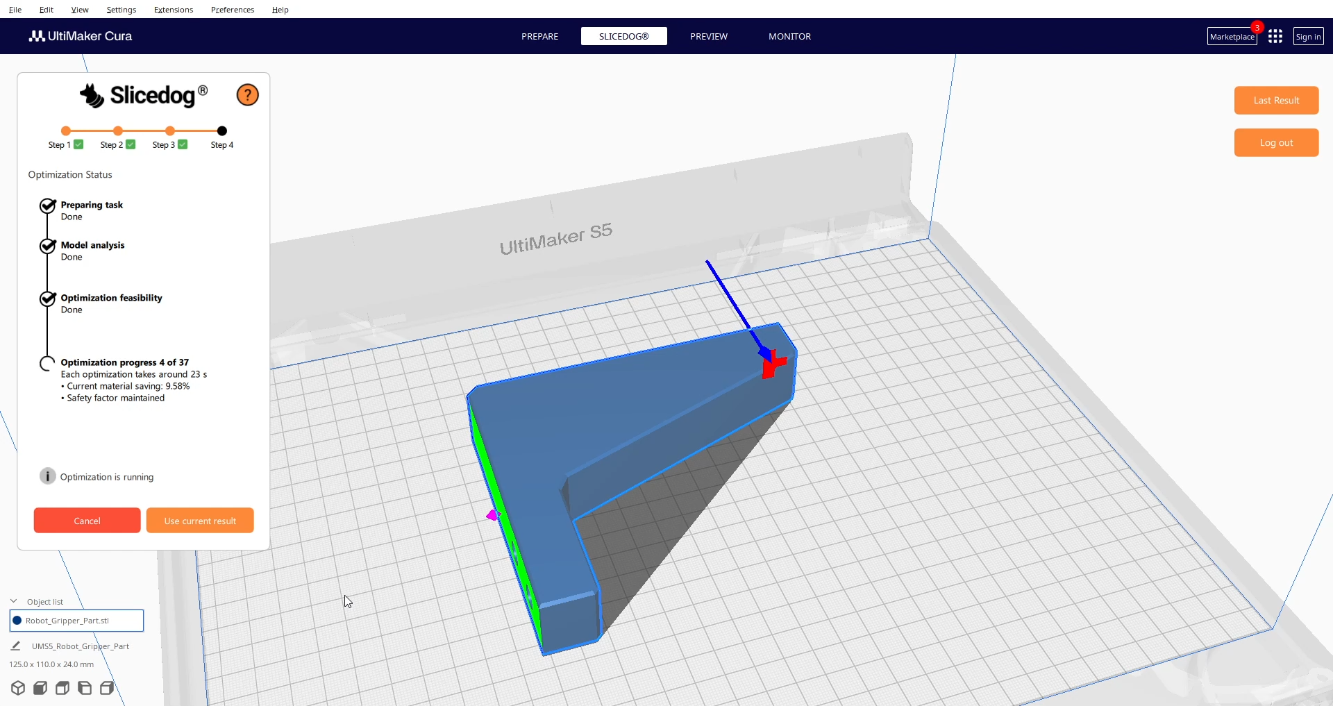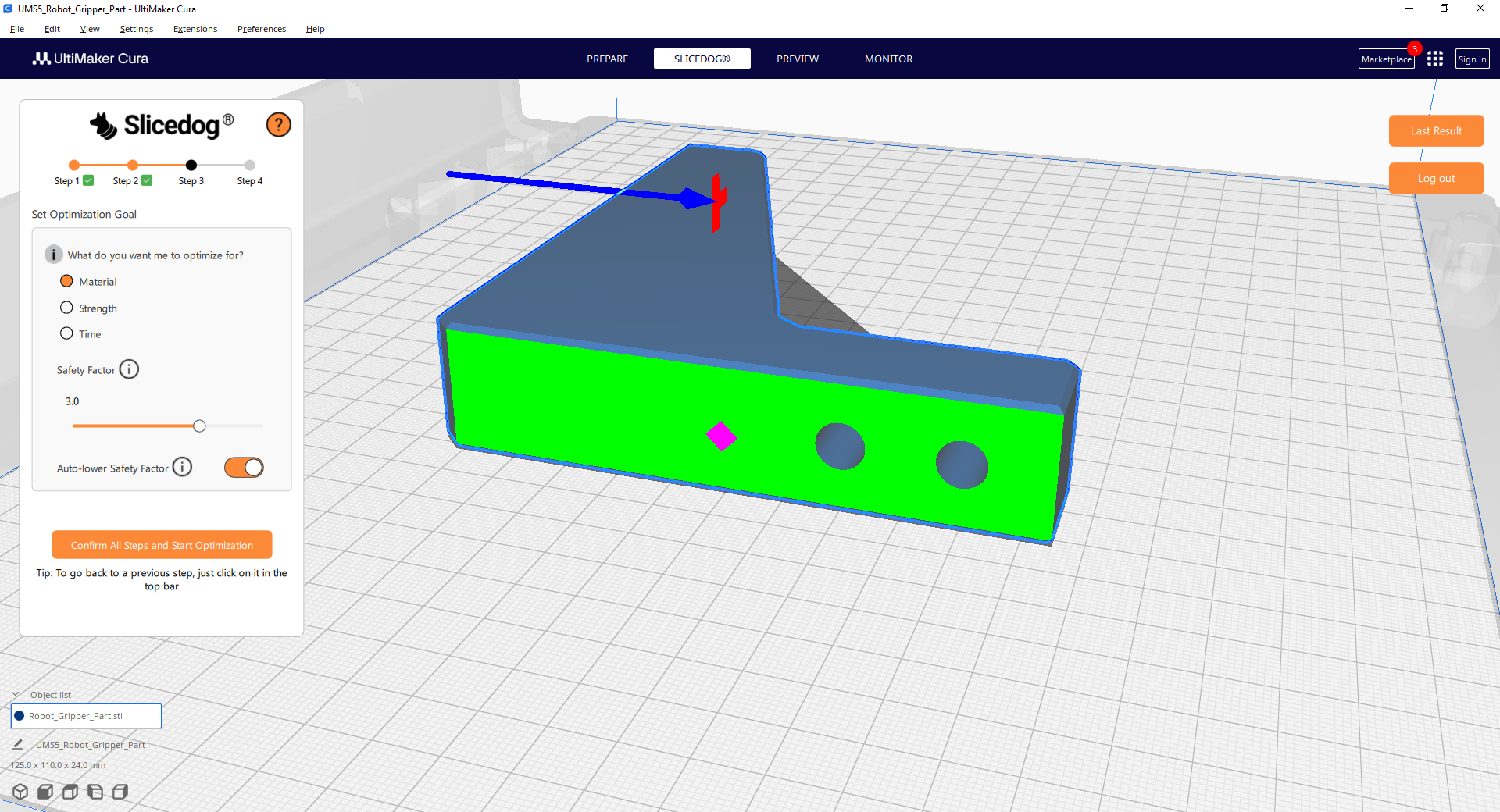Optimization Feasibility – confirms that the part will remain strong under load when printed with the strongest settings. If no, Slicedog stops optimization. It wouldn’t make sense to optimize part that always breaks. Takes about 30 seconds on sample model